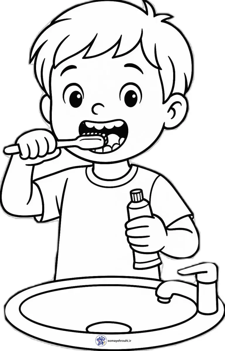 در این کاربرگ، تصویر یک پسر بچه نشان داده شده که در حال مسواک زدن است و در دست دیگرش خمیردندان دارد.