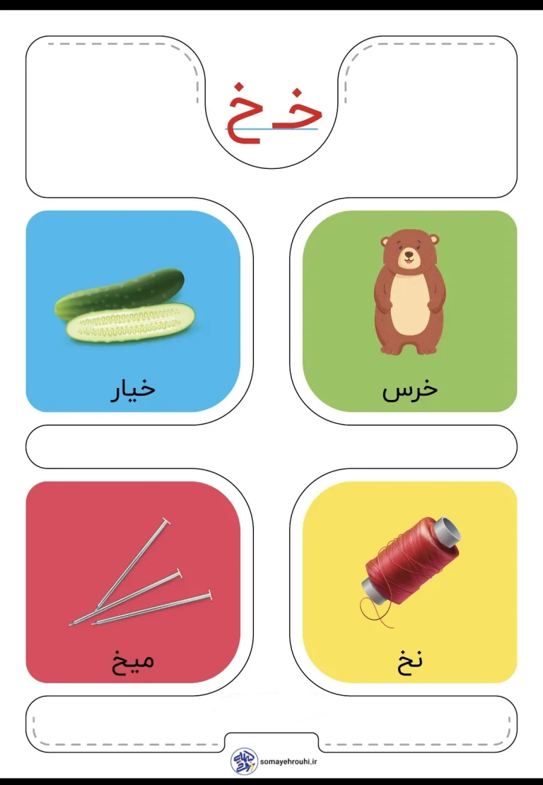 امروز براتون کارت حروف الفبا نشانه خ پایه اول دبستان آماده کردیم و به بررسی این حرف میپردازیم.