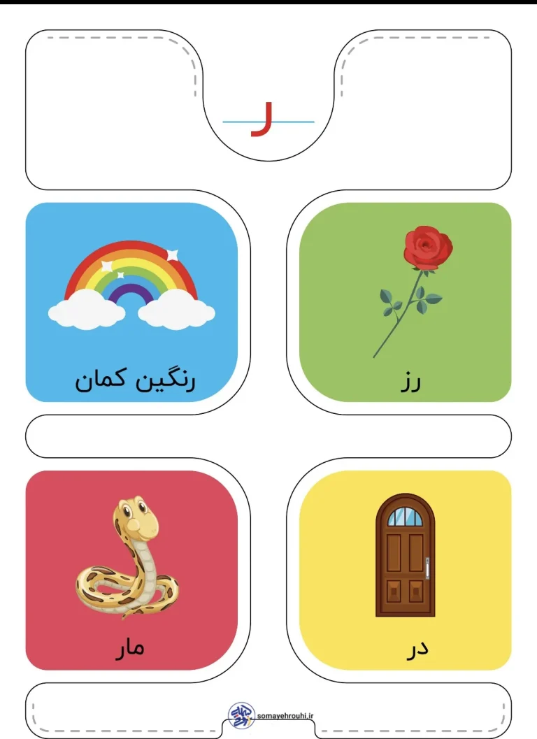 سفر به انتهای کلمات: نشانه «ر» فقط در ابتدای کلمات نمینشیند؛ گاهی مثل یک قهرمان در انتهای کلمات ظاهر میشود تا آنها را کامل کند. وقتی به تصویر «مار» یا «در» نگاه میکنیم، متوجه میشویم که صدای «ر» در پایان کلمه شنیده میشود. این تقابل به کودک کمک میکند تا جایگاههای مختلف یک نشانه (اول و غیر اول) را در ذهن خود تثبیت کند، هرچند که شکل این نشانه در همه جا یکسان است.