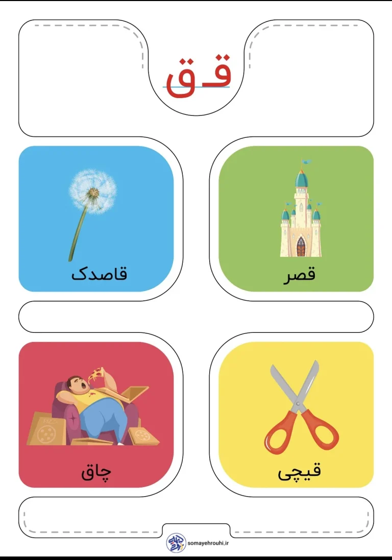 کارت حروف الفبا نشانه «ق» فارسی اول دبستان با هدف آشنایی عمیق و ماندگار با این حرف طراحی شده است. در این کارت، نوآموزان با شکل نوشتاری نشانه «ق»، صدای آن در کلمات و نمونهواژههای ملموس مانند «قاصدک»، «قصر»، «قیچی» و «چاق» آشنا میشوند. هدف اصلی این کارت، تقویت مهارت تشخیص صدا، افزایش دقت دیداری و شنیداری و آمادهسازی دانشآموز برای خواندن و نوشتن صحیح کلمات فارسی است.