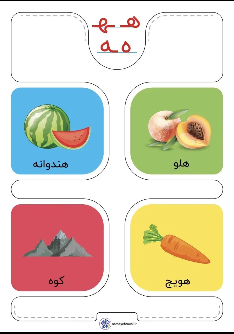 این کارت حروف الفبا نشانه «هـ» فارسی اول دبستان طراحی شده تا یادگیری این نشانه را به شکلی ساده، جذاب و تصویری امکانپذیر کند. در این کارت، دانشآموزان با شکلهای مختلف «هـ» (اول، وسط و آخر کلمه) آشنا میشوند و با دیدن تصاویر مرتبط مانند «هندوانه، هلو، کوه و هویج» ارتباط معنایی و دیداری مؤثری برقرار میکنند. طراحی رنگارنگ و کودکپسند کارت باعث افزایش تمرکز و علاقهی کودک به یادگیری زبان فارسی میشود.