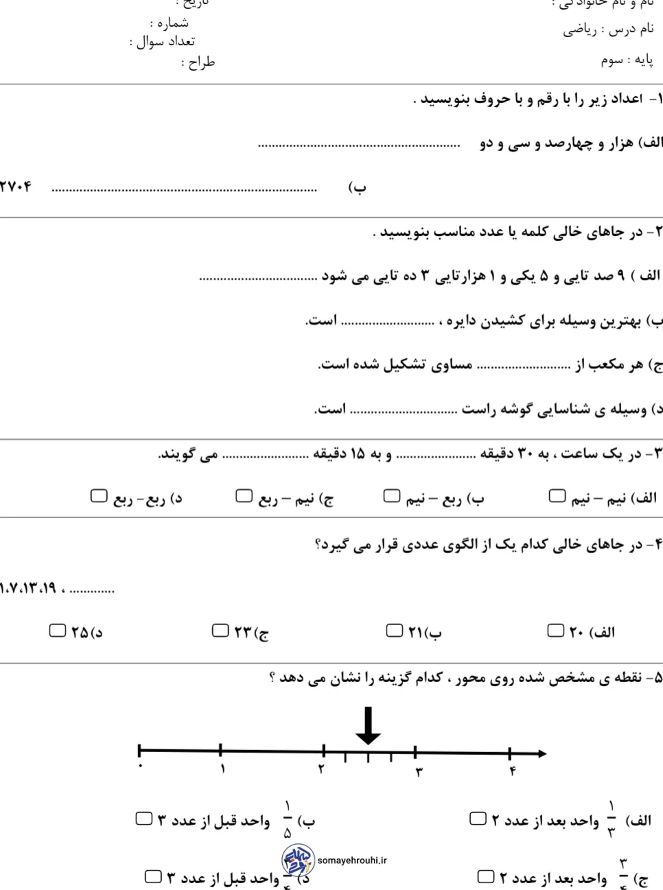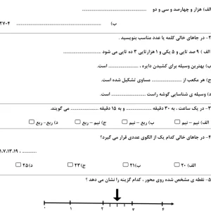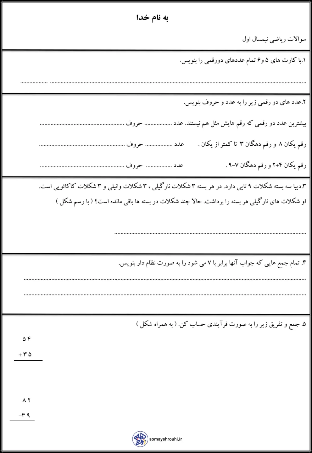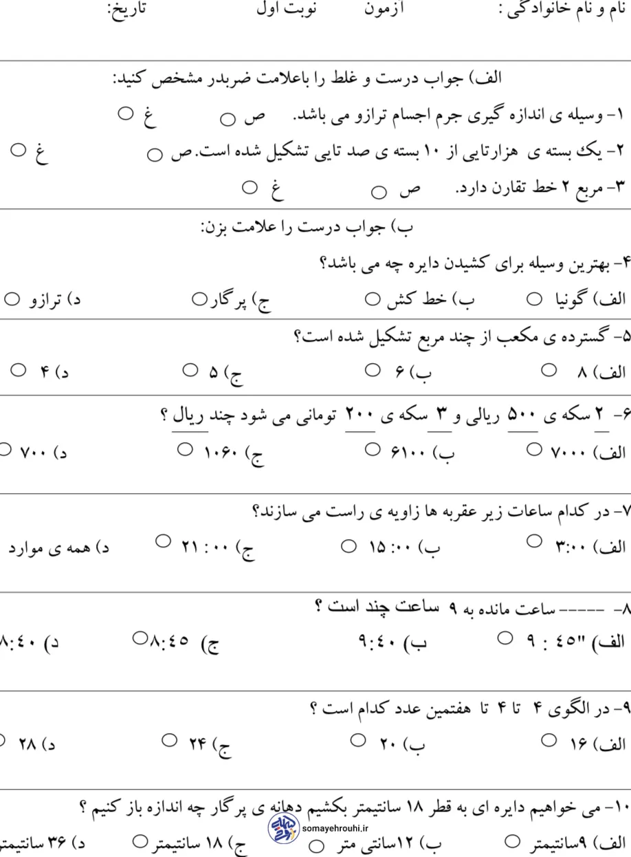 مشاهده بزرگ کاربرگ آزمونکاربرگ های پایه دومکاربرگ های ریاضی پایه دوم آزمون ریاضی نوبت اول پایه دوم دبستان