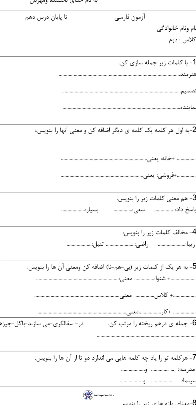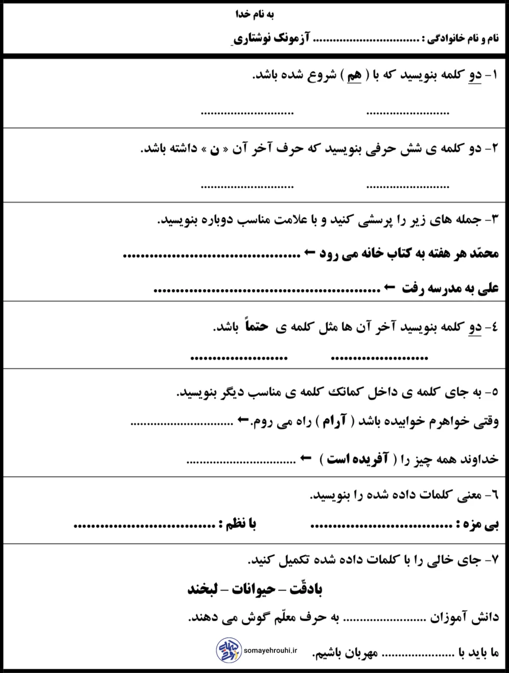 مشاهده بزرگ کاربرگ آزمونکاربرگ های پایه دومکاربرگ های فارسی پایه دوم آزمون فارسی نوبت اول کلاس دوم دبستان