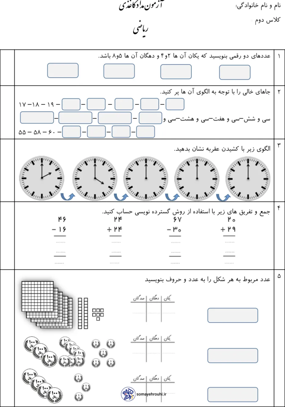 مشاهده بزرگ کاربرگ آزمونکاربرگ های پایه دومکاربرگ های ریاضی پایه دوم آزمون دی ماه ریاضی کلاس دوم دبستان