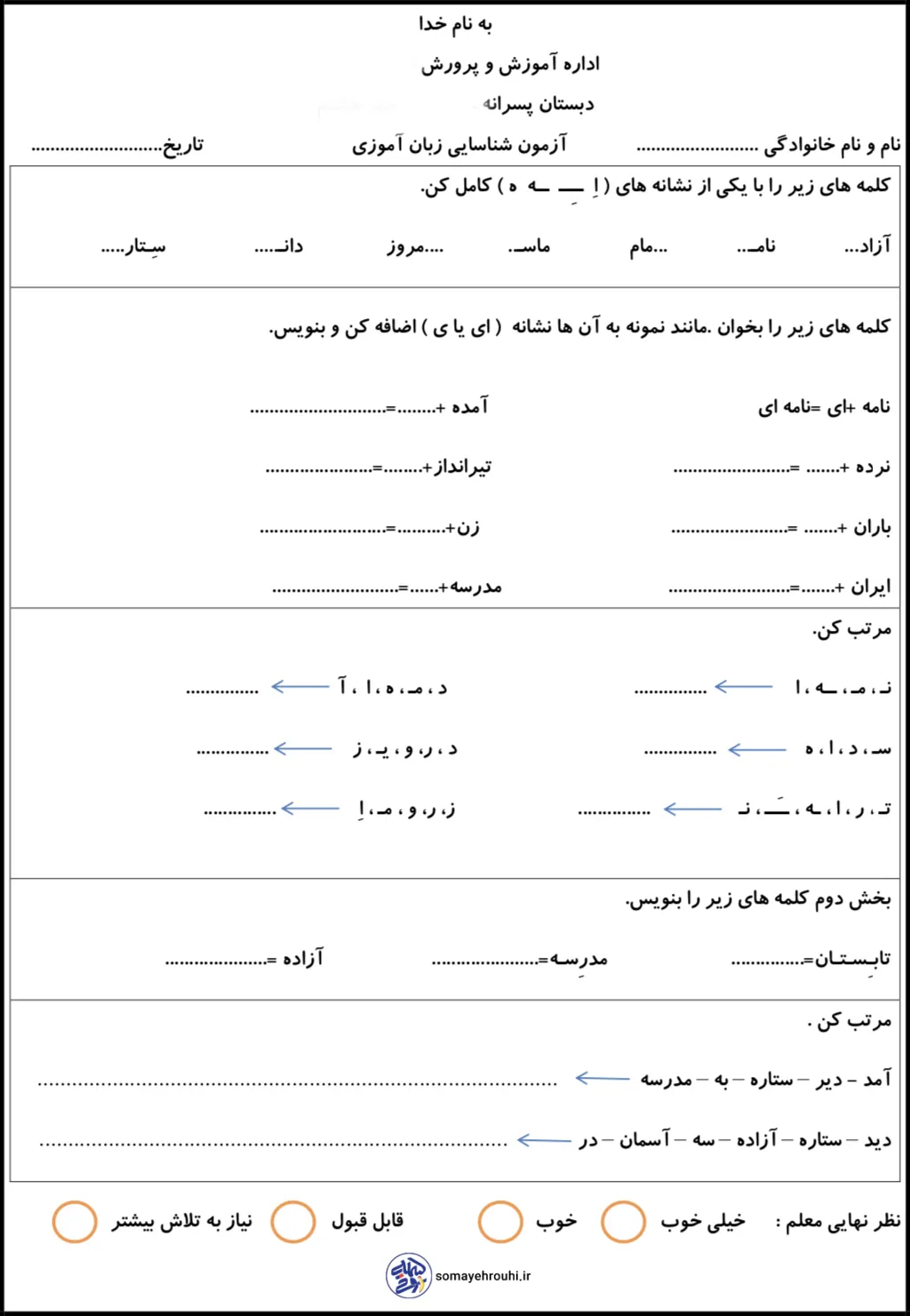 آزمون نوبت دوم فارسی پایه اول دبستان
