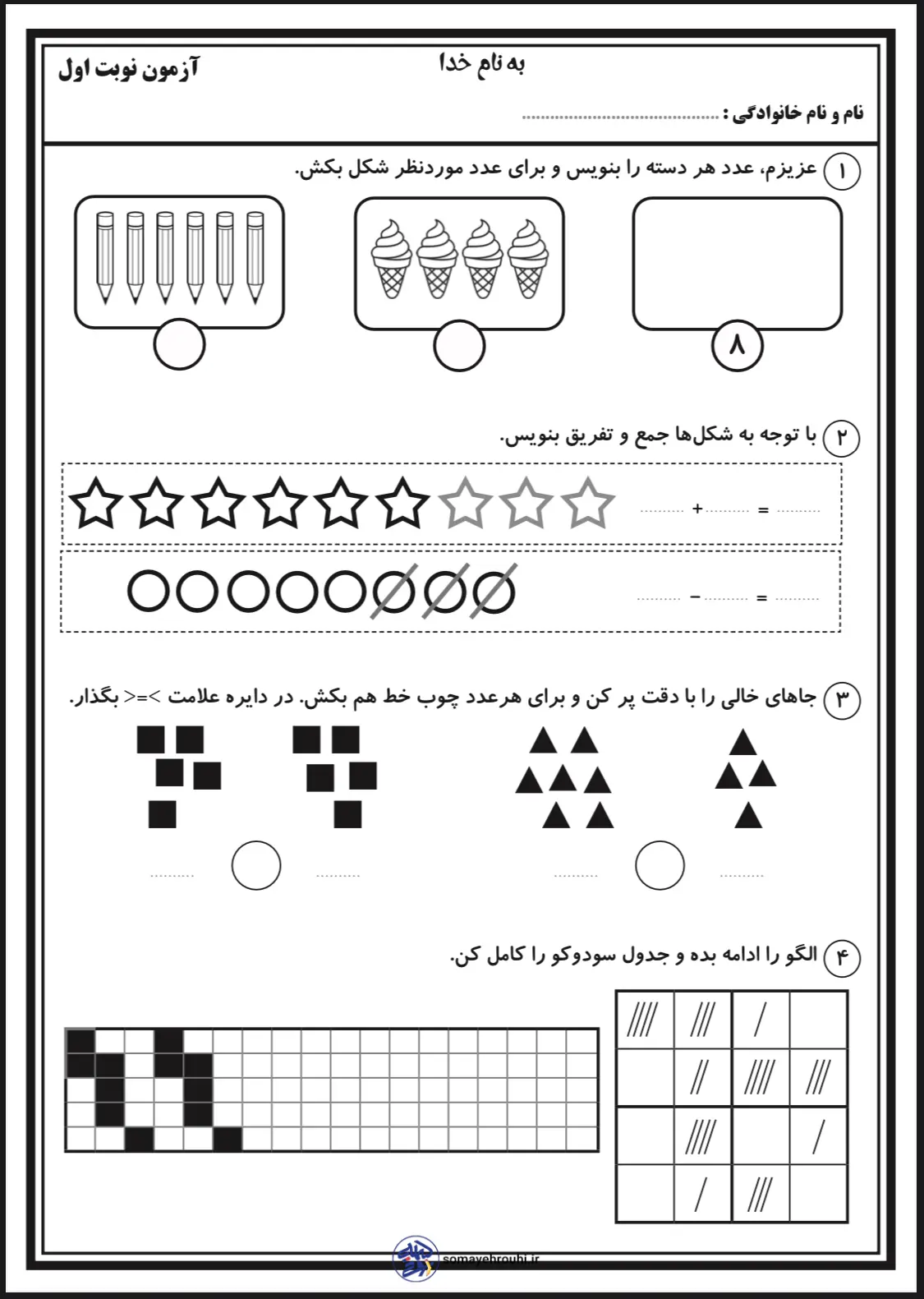 آزمون نوبت اول ریاضی پایه اول دبستان