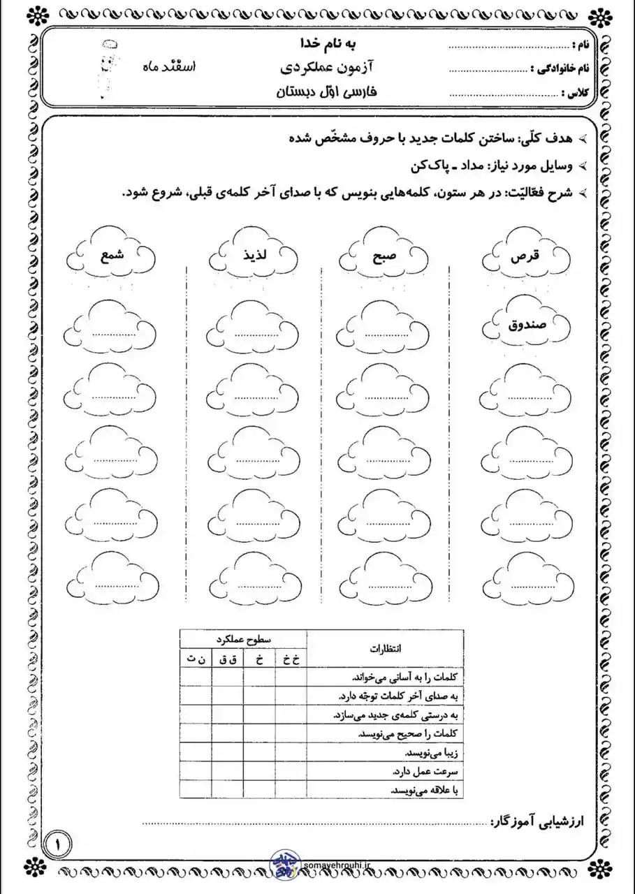 مشاهده بزرگ پایه اولفارسیکاربرگ آزمونکاربرگ های فارسی پایه اول دانلود کاربرگ آزمون فارسی اول ابتدایی فروردین ماه