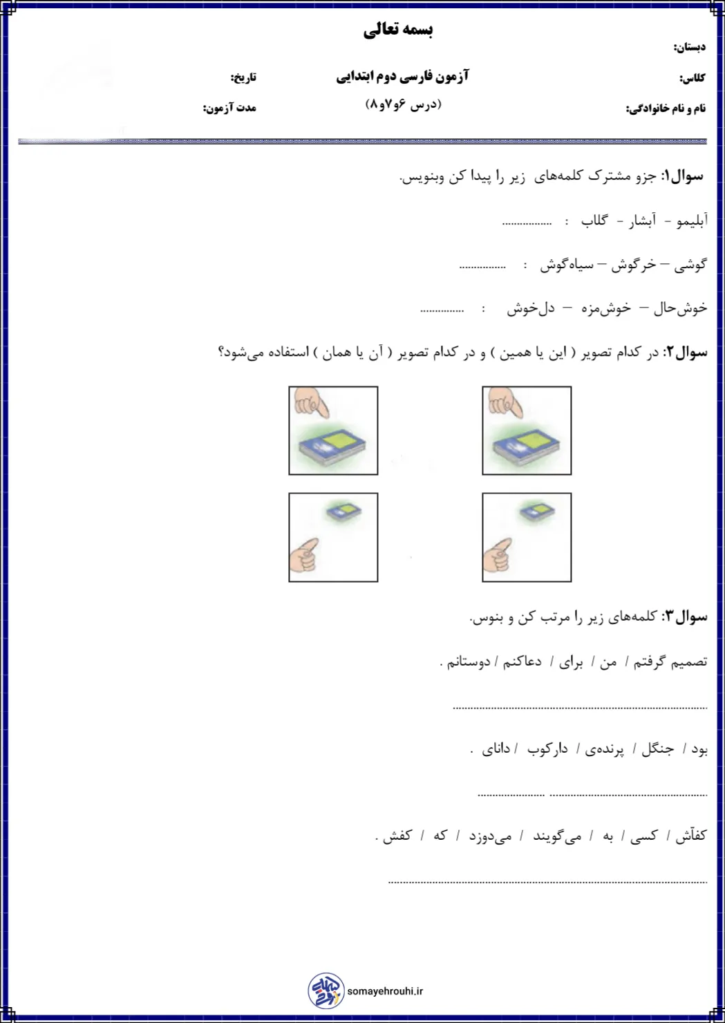 مشاهده بزرگ کاربرگ آزمونکاربرگ های پایه دومکاربرگ های فارسی پایه دوم آزمون فارسی درس ۶ و ۷ و ۸ پایه دوم دبستان با پاسخنامه