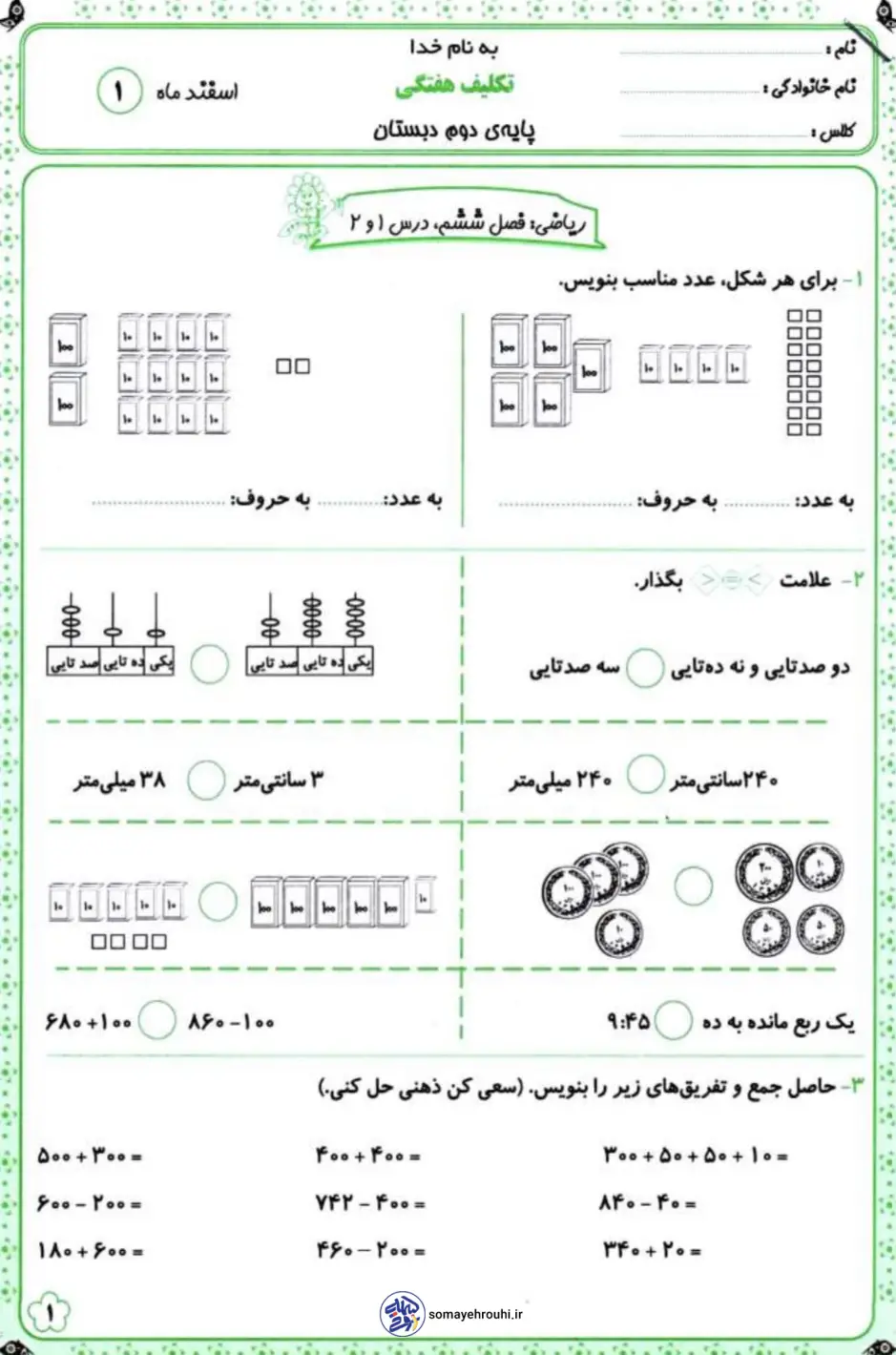 مشاهده بزرگ کاربرگ های پایه دومکاربرگ های ریاضی پایه دوم کاربرگ فصل ۶ ریاضی دوم دبستان جمع و تفریق اعداد سه رقمی
