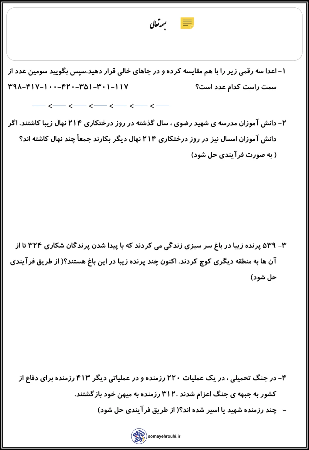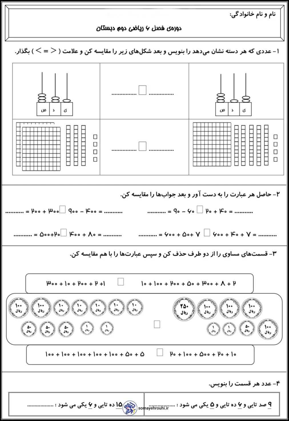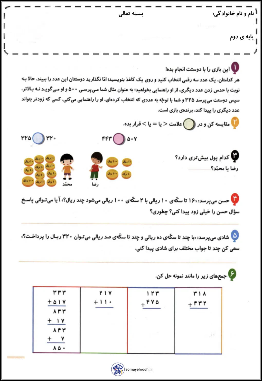 مشاهده بزرگ کاربرگ های پایه دومکاربرگ های ریاضی پایه دوم فصل ششم ریاضی جمع و تفریق اعداد سه رقمی دوم دبستان
