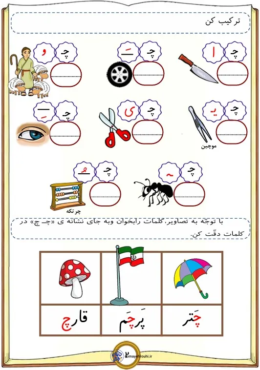 مشاهده بزرگ آموزش حروف الفباپایه اولکاربرگ های فارسی پایه اول کاربرگ نشانه چ برای کلاس اول + تمرین های متنوع