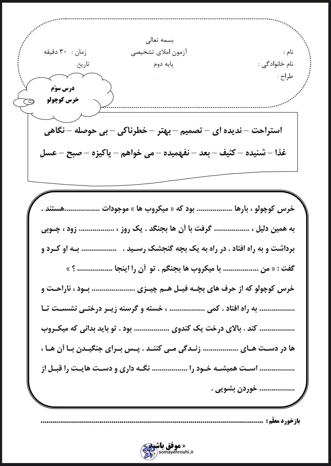 مشاهده بزرگ کاربرگ آزمونکاربرگ های پایه دومکاربرگ های فارسی پایه دوم آزمون املا درس۳ فارسی دوم دبستان