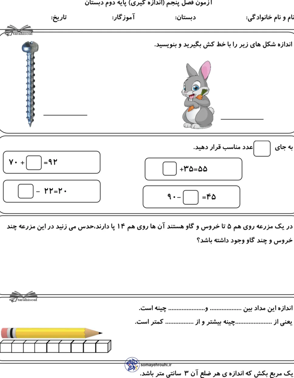 مشاهده بزرگ کاربرگ های پایه دومکاربرگ های ریاضی پایه دوم کاربرگ ریاضی فصل پنجم پایه دوم دبستان مبحث اندازه گیری