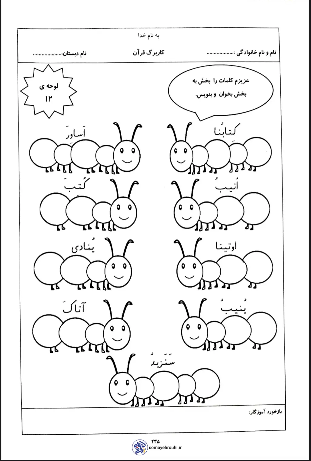 کاربرگ قرآن لوحه 12 پایه اول دبستان