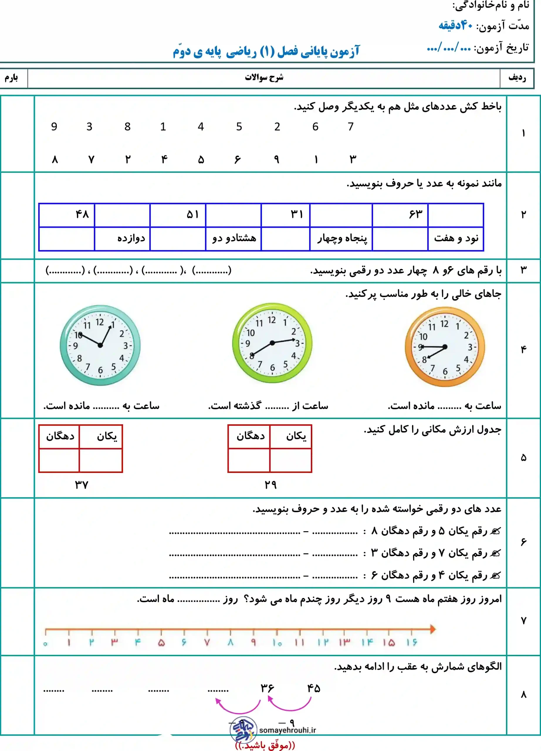مشاهده بزرگ کاربرگ های پایه دومکاربرگ های ریاضی پایه دوم آزمون فصل دوم ریاضی دوم دبستان + پاسخنامه (رایگان)