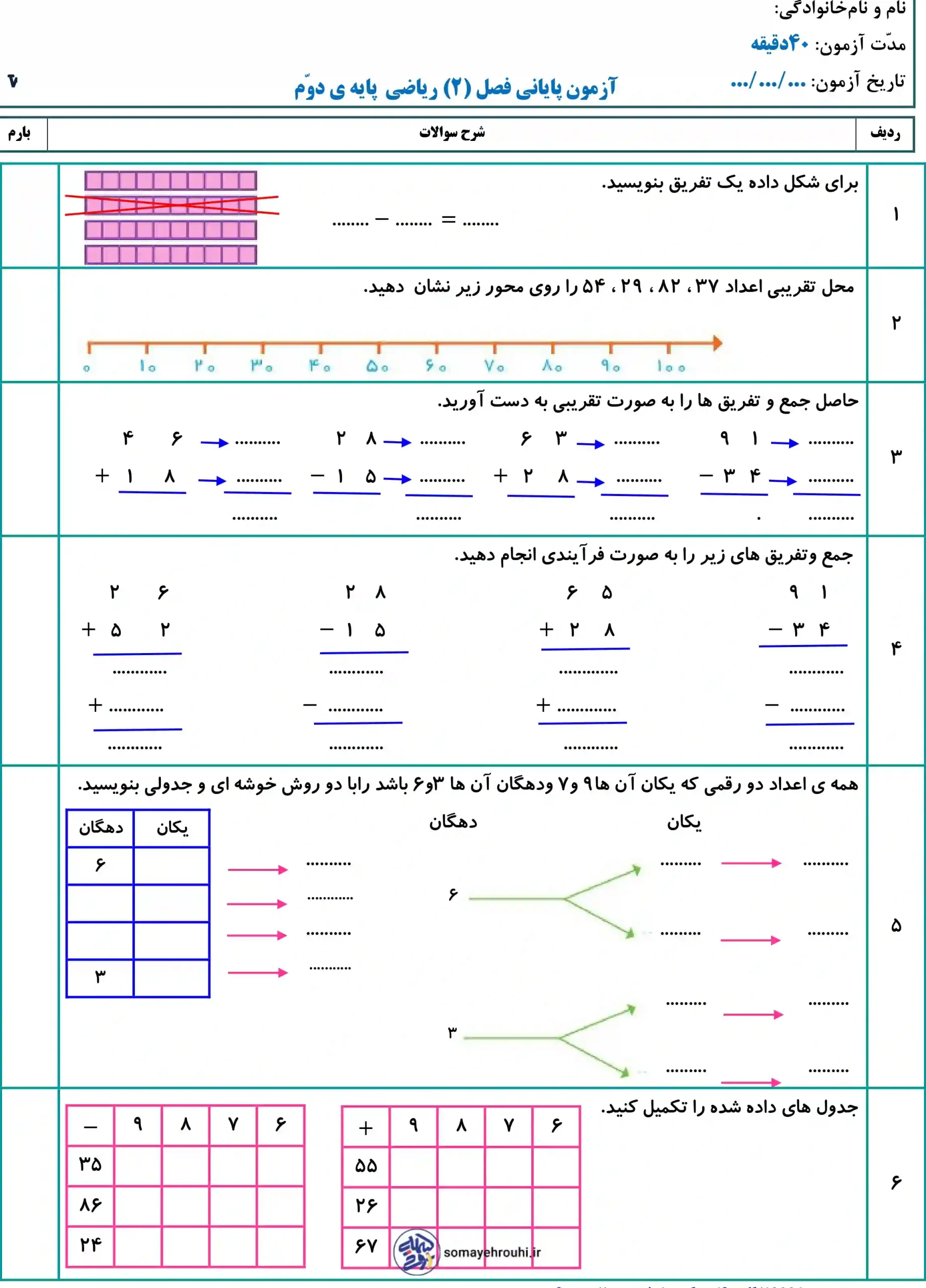 مشاهده بزرگ کاربرگ آزمونکاربرگ های پایه دومکاربرگ های ریاضی پایه دوم آزمون ارزیابی اسفندماه ریاضی پایه دوم دبستان