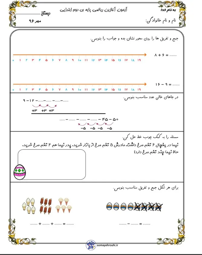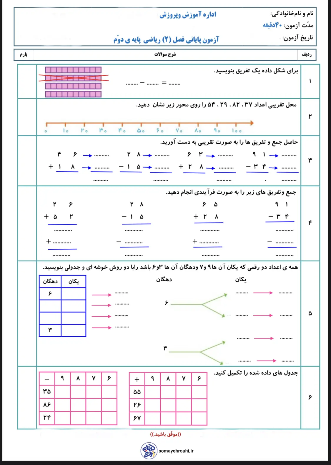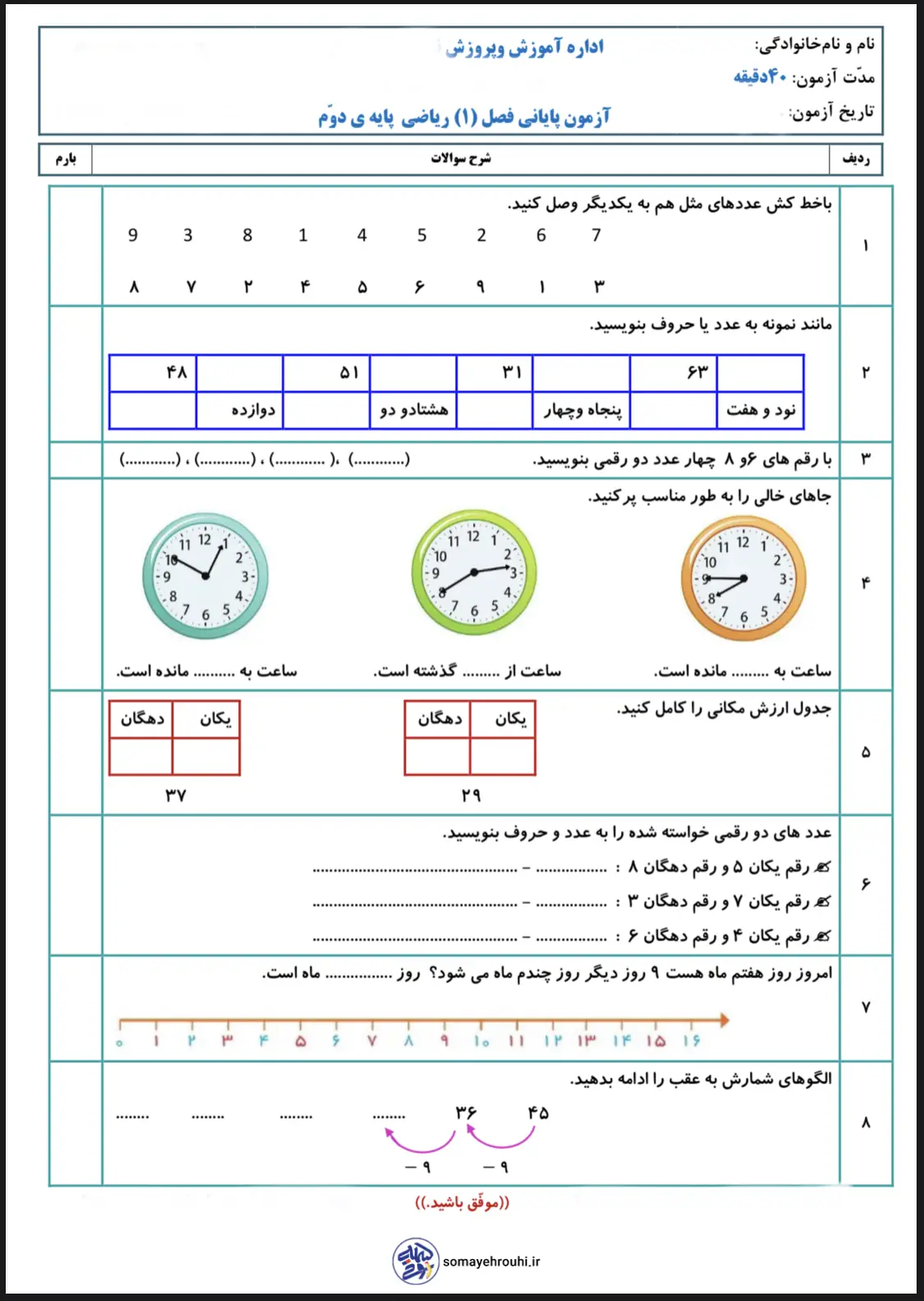 دانلود ارزشیابی ریاضی پایه دوم دبستان