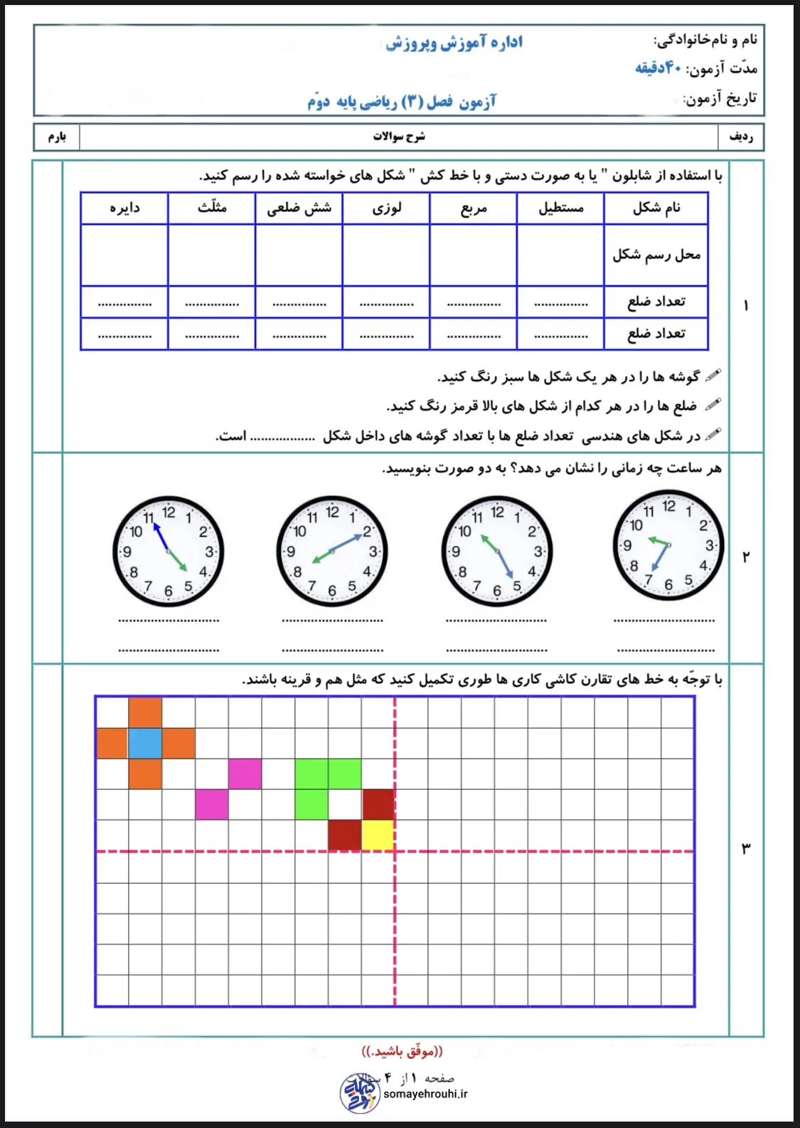 آزمون فصل ۳ ریاضی دوم دبستان با جواب