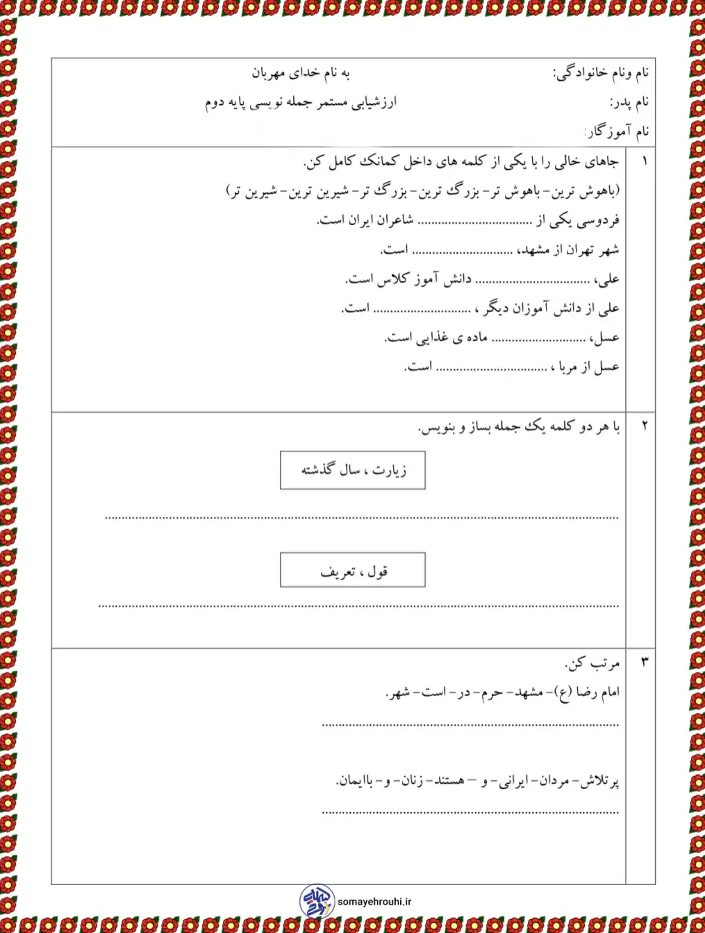مشاهده بزرگ کاربرگ آزمونکاربرگ های پایه دومکاربرگ های فارسی پایه دوم ارزشیابی جمله نویسی فارسی دوم دبستان