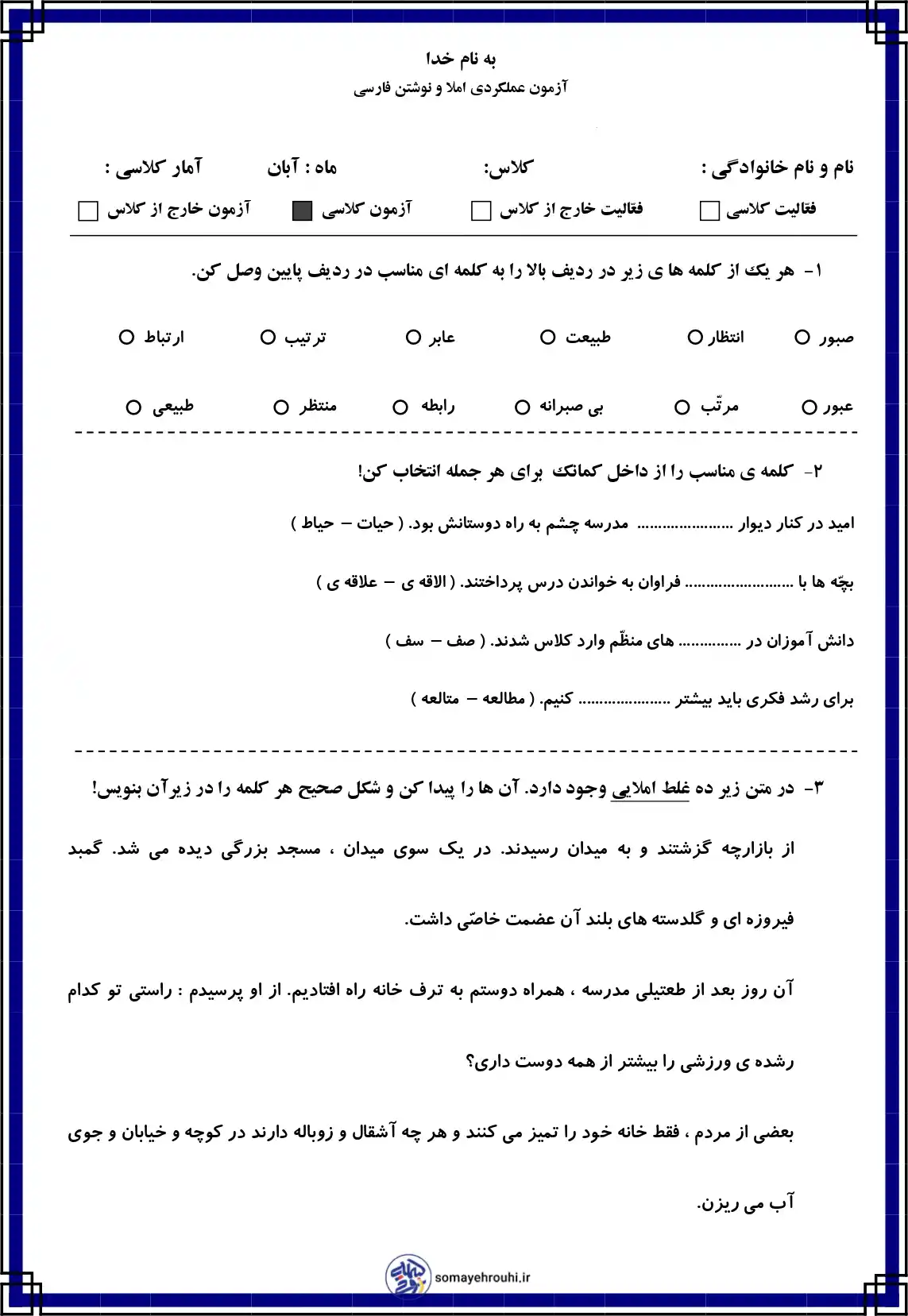 مشاهده بزرگ کاربرگ آزمونکاربرگ های پایه دومکاربرگ های فارسی پایه دوم ارزشیابی فارسی دوم دبستان آذرماه