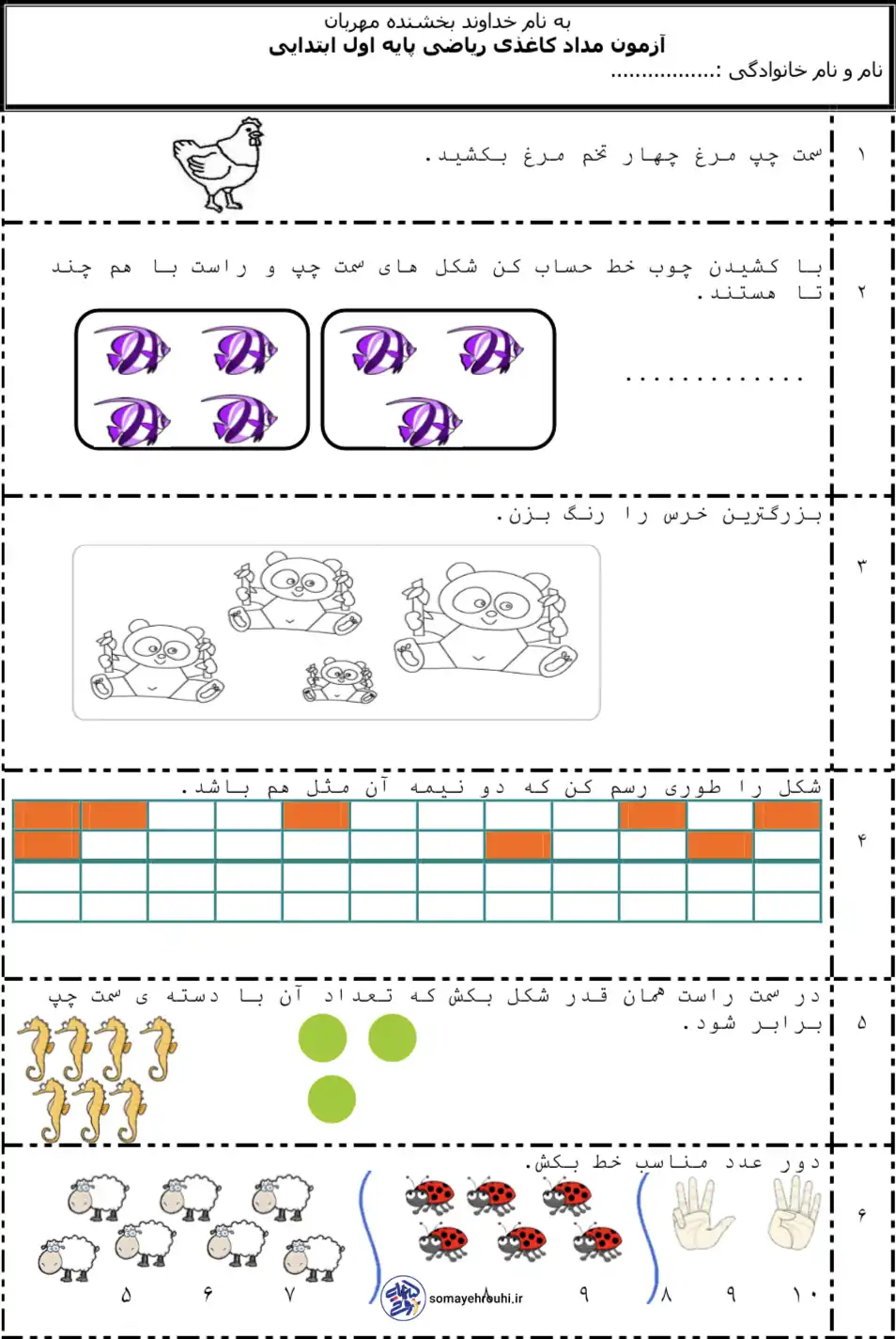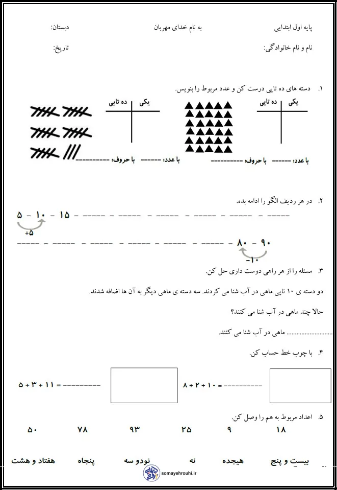 مشاهده بزرگ آموزش اعدادپایه اولکاربرگ آزمونکاربرگ های ریاضی پایه اول آزمون مدادکاغذی ریاضی نوبت اول پایه اول