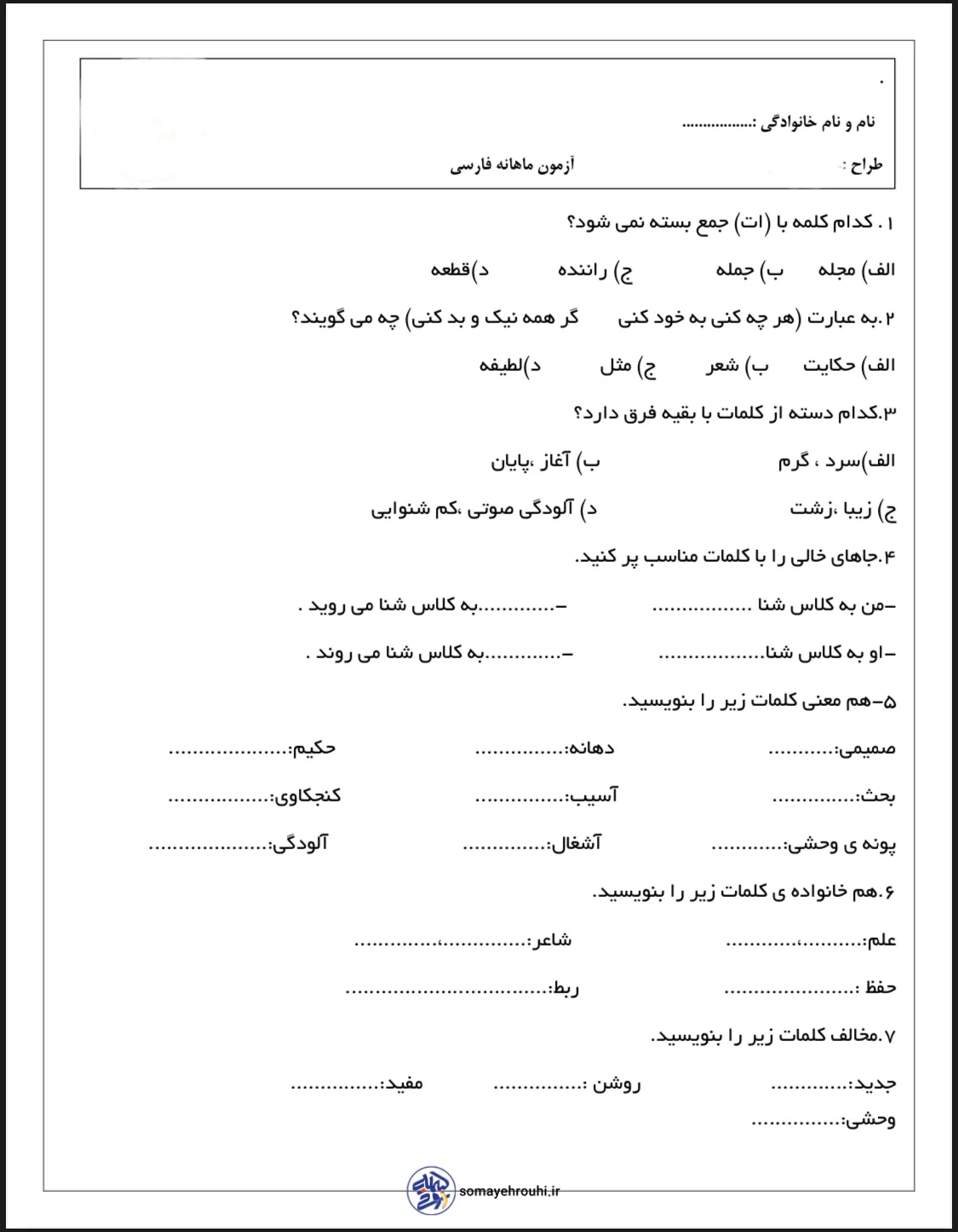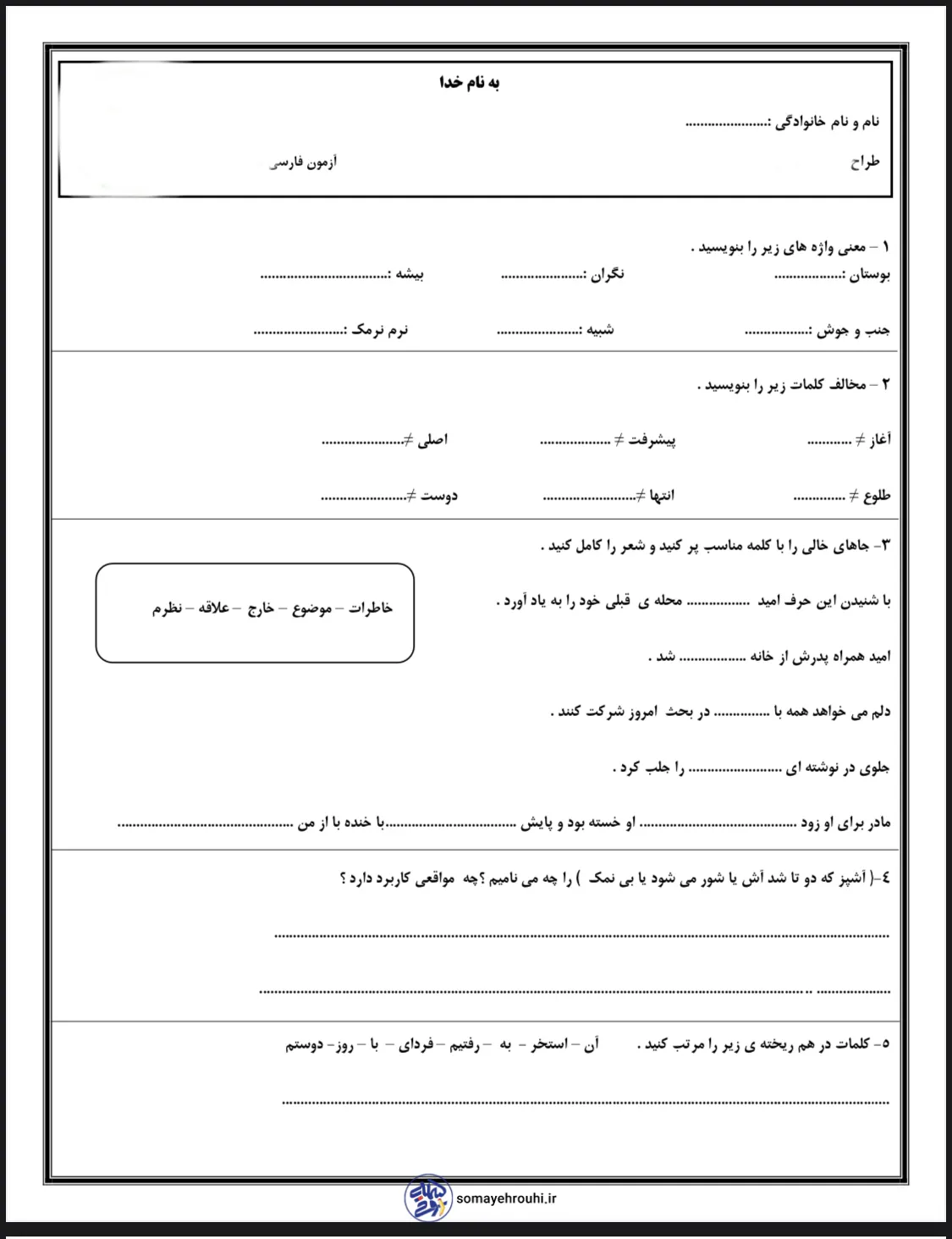 مشاهده بزرگ کاربرگ آزمونکاربرگ های پایه دومکاربرگ های فارسی پایه دوم آزمون آبان ماه فارسی پایه دوم دبستان