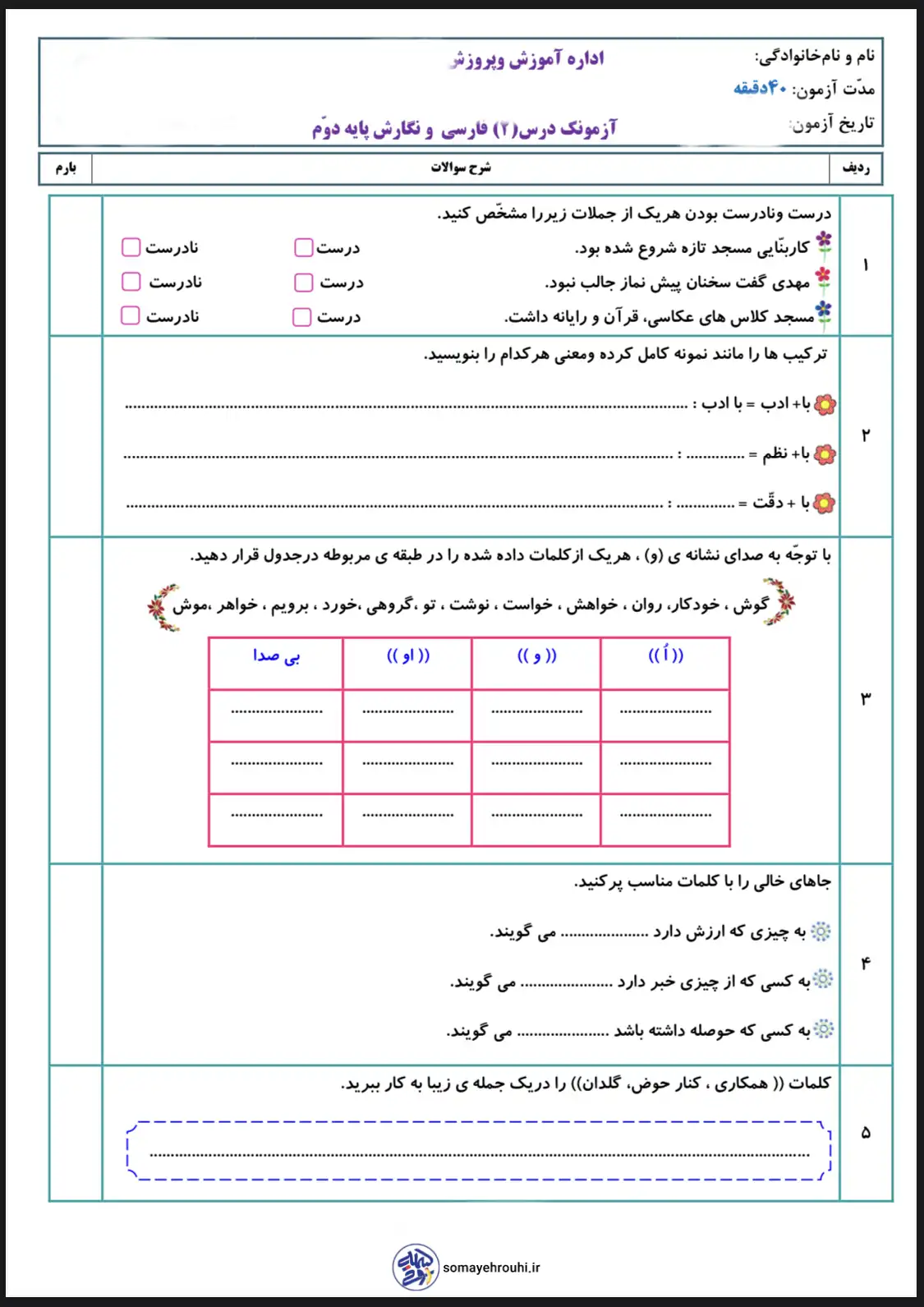 مشاهده بزرگ کاربرگ آزمونکاربرگ های پایه دومکاربرگ های فارسی پایه دوم آزمون درس ۲ فارسی پایه دوم دبستان با جواب