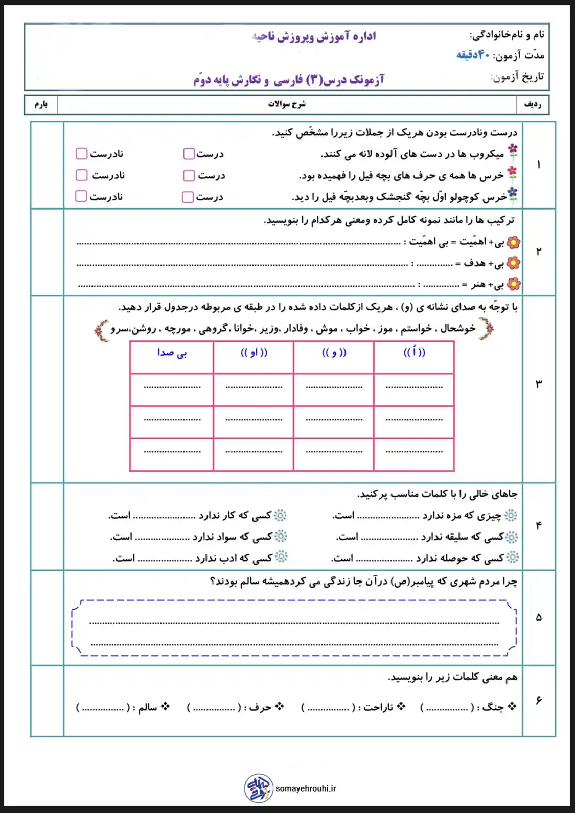 مشاهده بزرگ کاربرگ آزمونکاربرگ های پایه دومکاربرگ های فارسی پایه دوم آزمون درس۳ فارسی پایه دوم دبستان با جواب