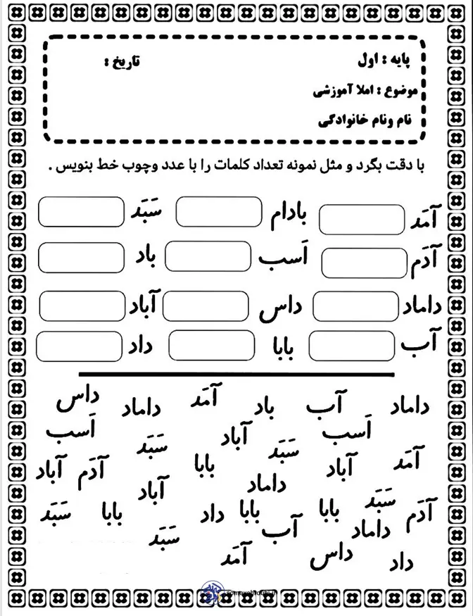 کاربرگ املا تا نشانه س کلاس اول