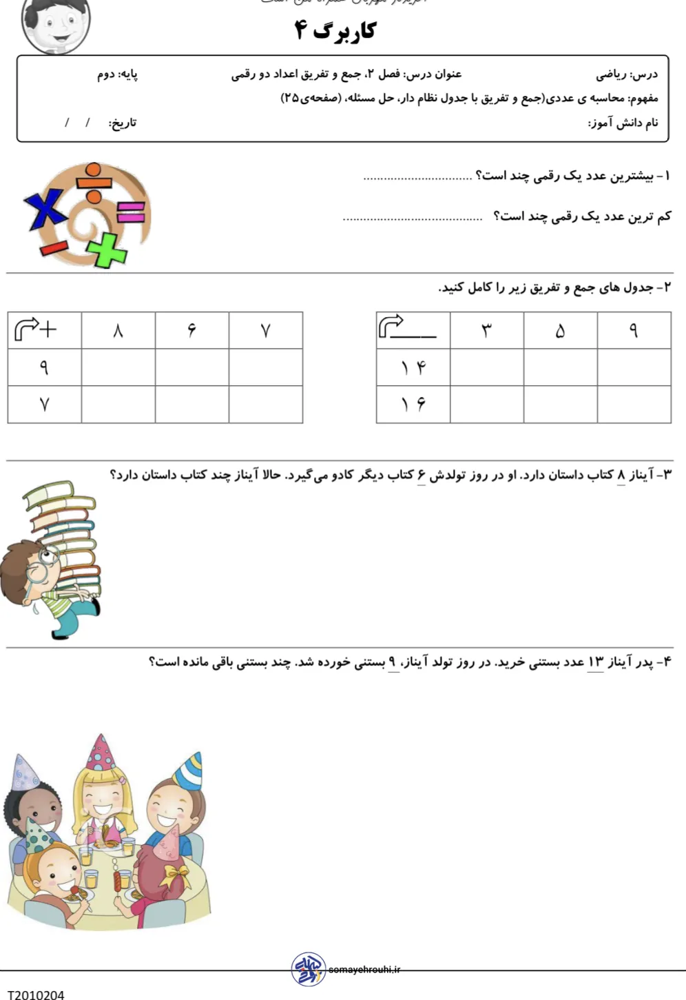 مشاهده بزرگ کاربرگ های پایه دومکاربرگ های ریاضی پایه دوم مجموعه کاربرگ های ریاضی فصل پنجم پایه دوم دبستان