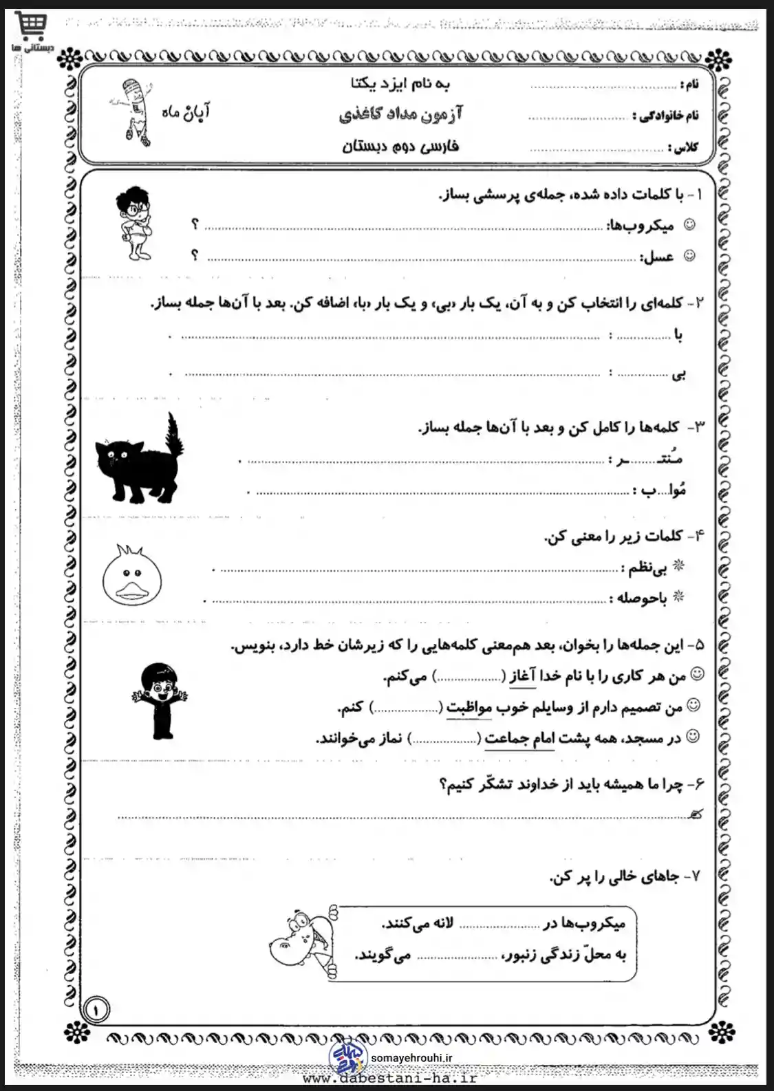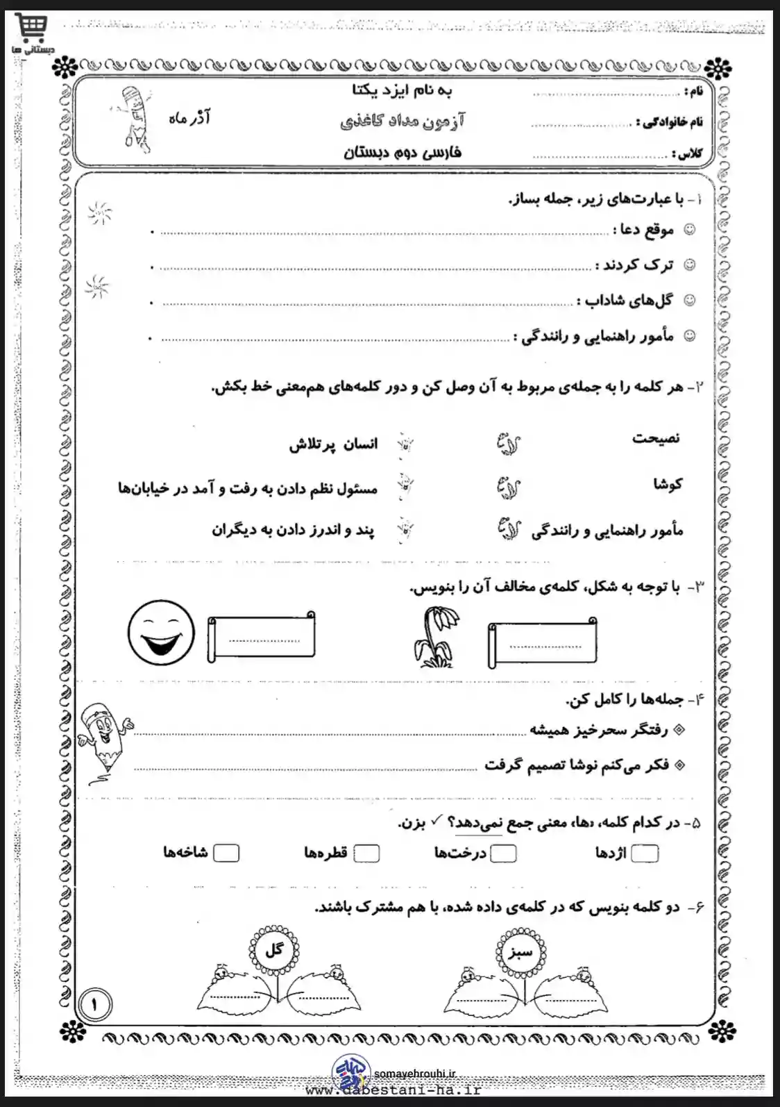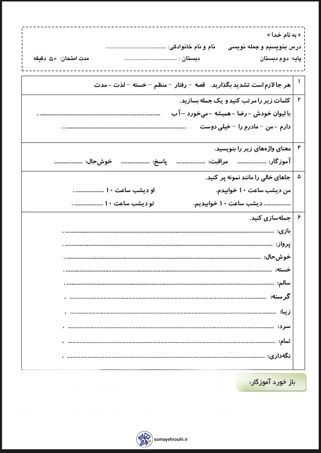 مشاهده بزرگ کاربرگ آزمون کاربرگ های پایه دوم کاربرگ های فارسی پایه دوم آزمون ماهانه فارسی دوم دبستان | کلمه و جمله سازی