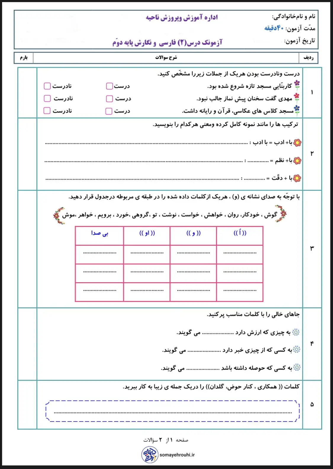 مشاهده بزرگ کاربرگ آزمون کاربرگ های پایه دوم کاربرگ های فارسی پایه دوم آزمون فارسی درس ۲ پایه دوم دبستان با پاسخنامه