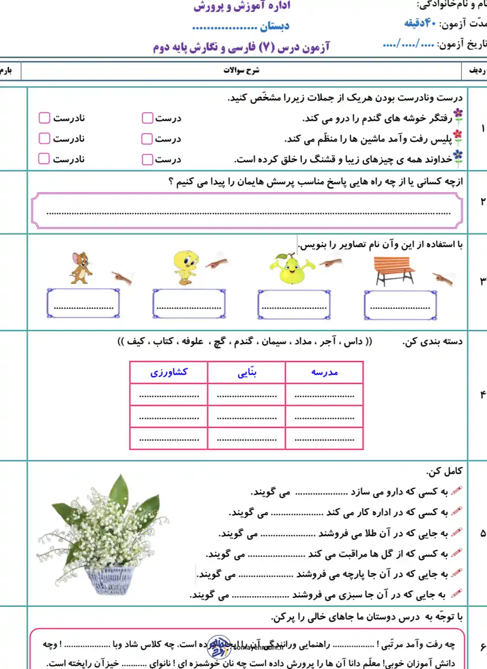 مشاهده بزرگ کاربرگ آزمونکاربرگ های پایه دومکاربرگ های فارسی پایه دوم آزمون فارسی درس ۵و۶و۷ دوم دبستان