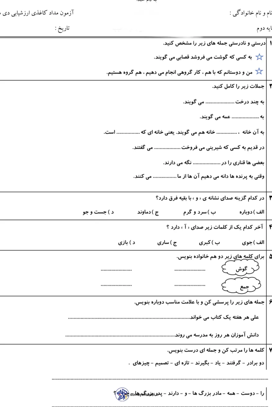 مشاهده بزرگ کاربرگ آزمونکاربرگ های پایه دومکاربرگ های فارسی پایه دوم ارزشیابی فارسی نوبت اول پایه دوم دبستان