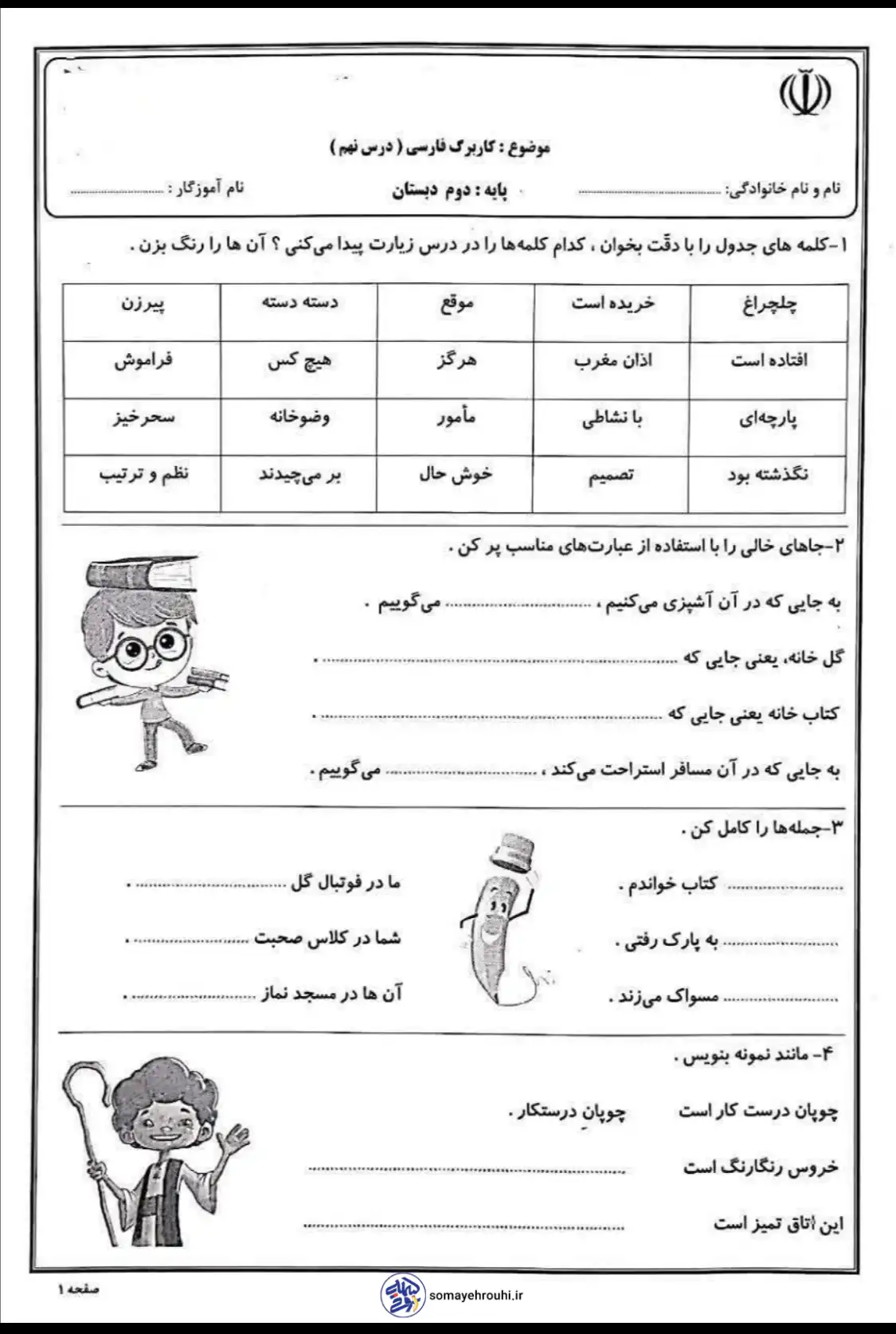 مشاهده بزرگ کاربرگ های پایه دومکاربرگ های فارسی پایه دوم کاربرگ مرور و تمرین درس دوازدهم فردوسی فارسی دوم با پاسخنامه