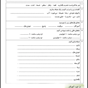 مشاهده بزرگ کاربرگ آزمونکاربرگ های پایه دومکاربرگ های فارسی پایه دوم آزمون ماهانه فارسی دوم دبستان | کلمه و جمله سازی