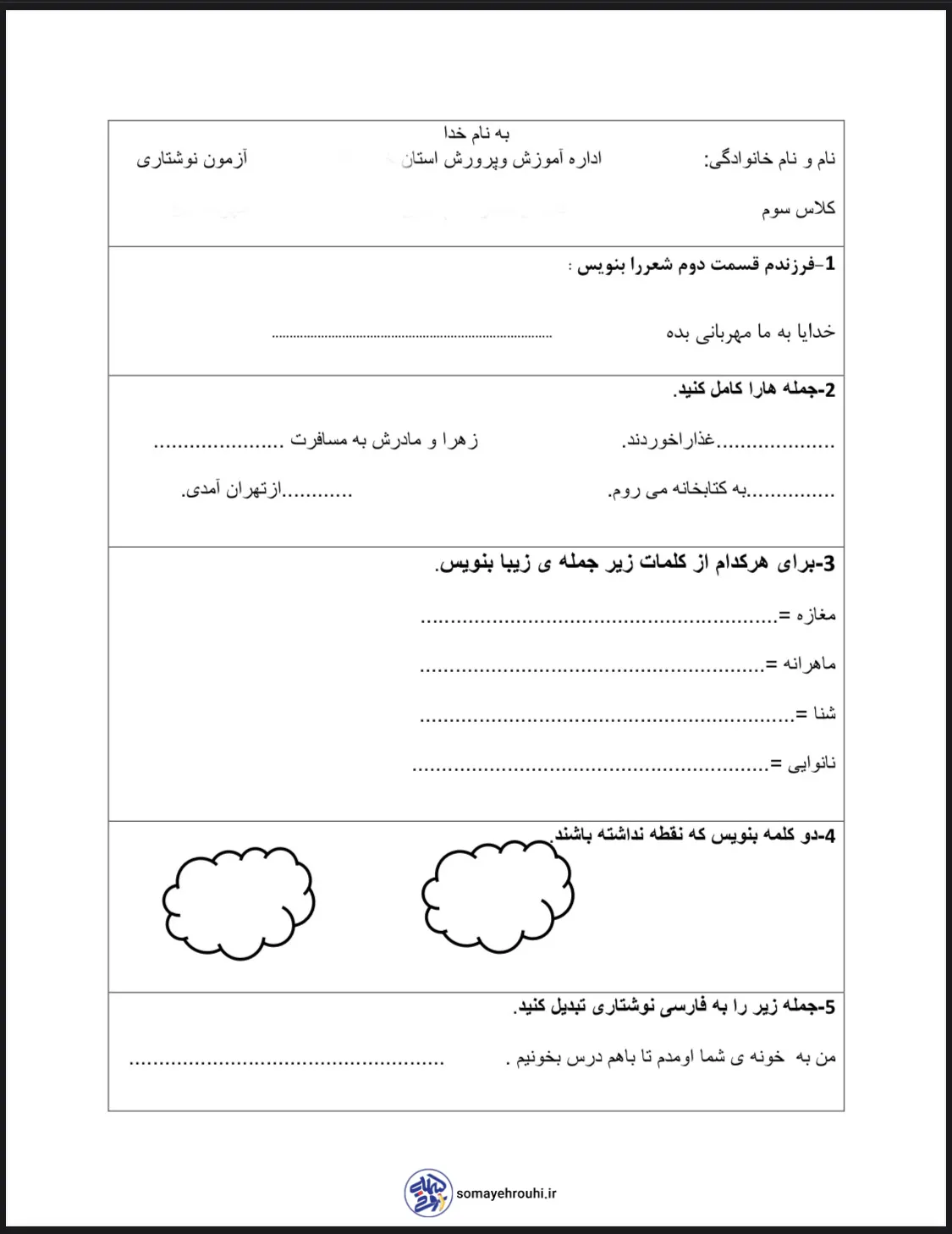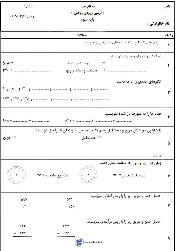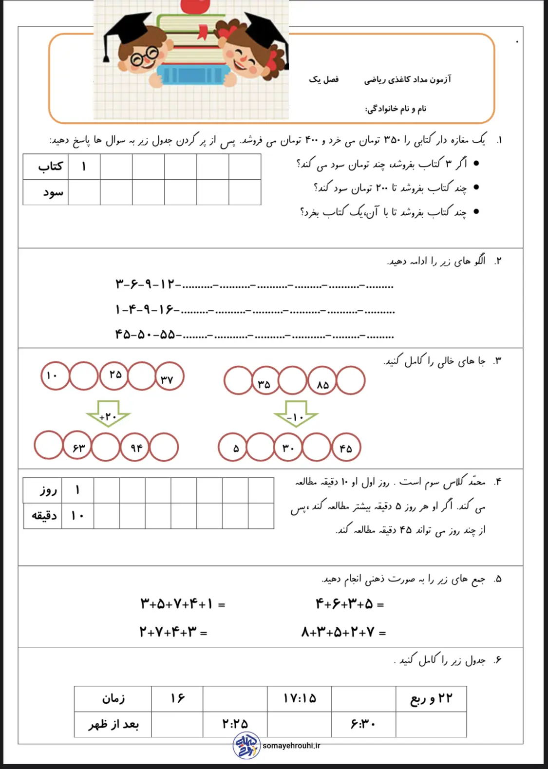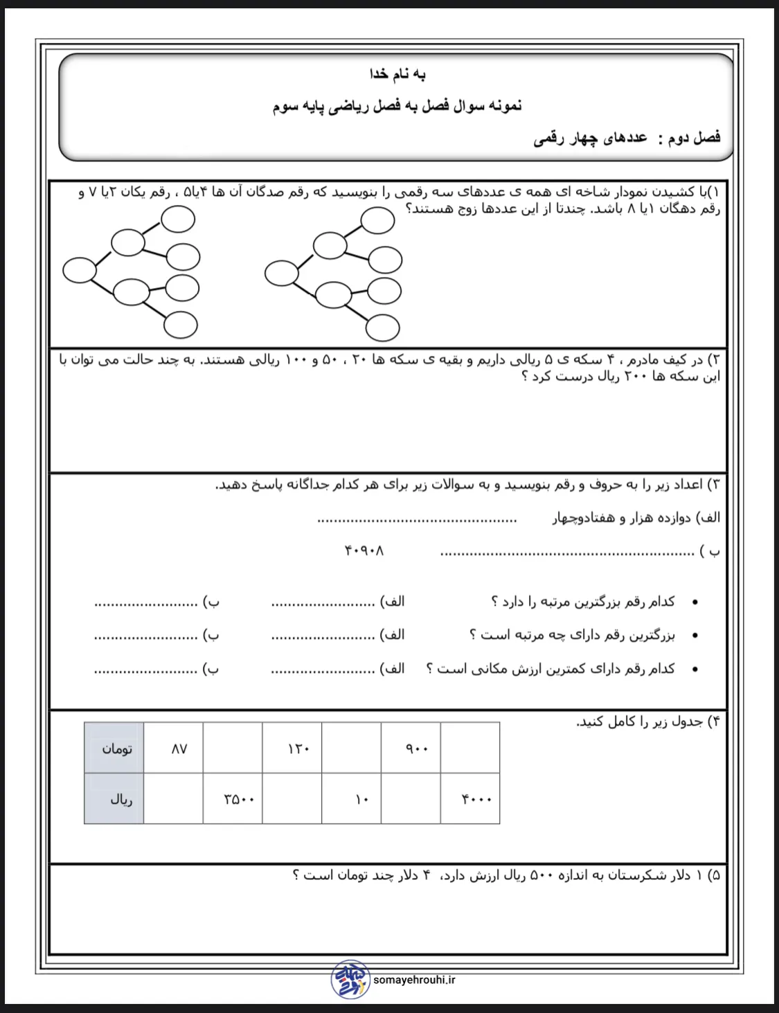 مشاهده بزرگ پایه سومریاضیکاربرگ آزمون دانلود نمونه سوال ریاضی سوم دبستان | فصل دوم ، عددهای چهار رقمی