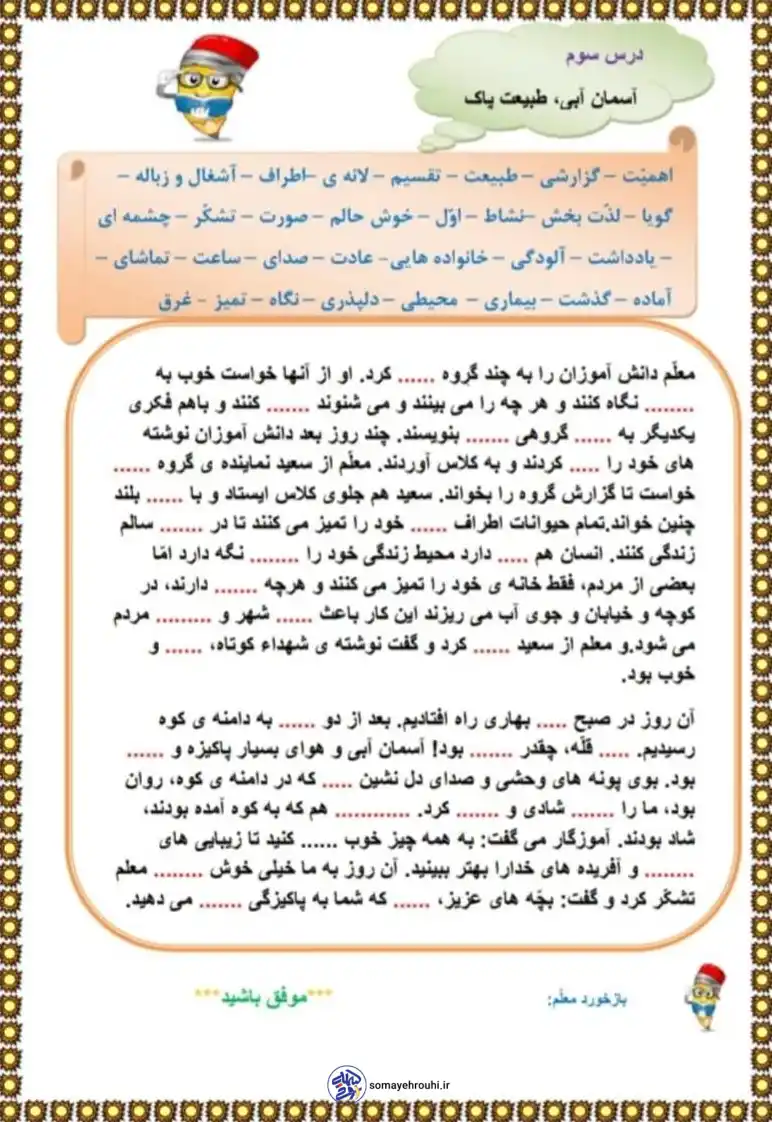 مشاهده بزرگ فارسیکاربرگ های پایه دومکاربرگ های فارسی پایه دوم کاربرگ املا کامل کردنی درس 6 فارسی دوم دبستان