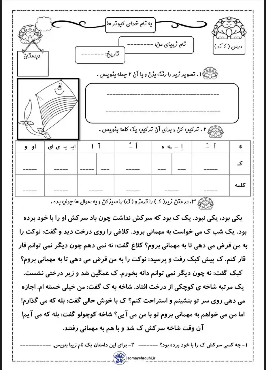 مشاهده بزرگ آموزش حروف الفباپایه اولفارسیکاربرگ های فارسی پایه اول کاربرگ تصویرنویسی نشانه ک اول ابتدایی