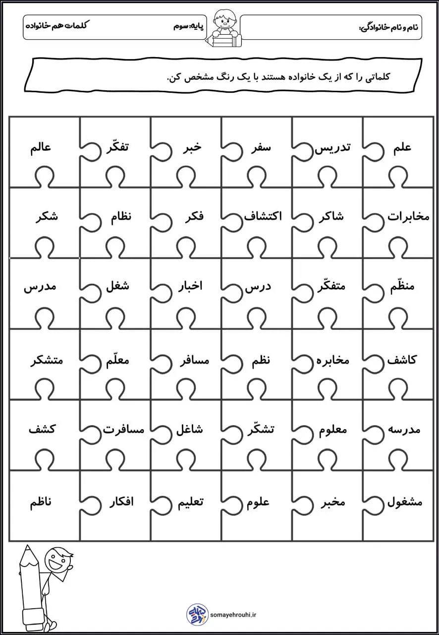 کاربرگ پازل کلمات هم خانواده فارسی سوم دبستان